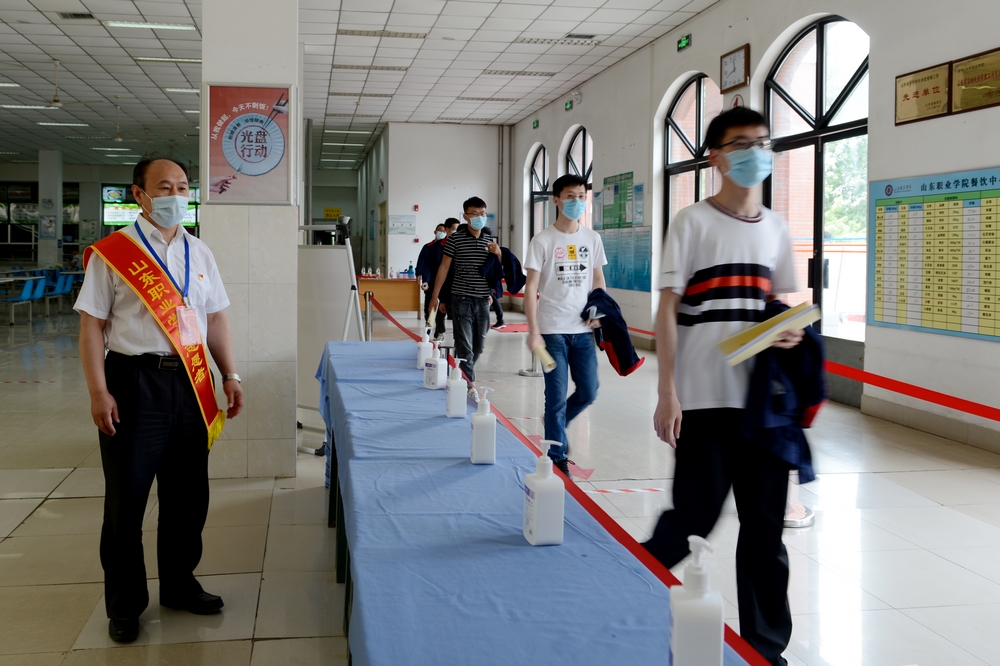 “同學們,請有序排隊,保持一米間隔。”“同學你好,請同向就座。”5月29日,是我院學生返校后,正式組織教學的第一天。中午時分,學院機關黨總支黨群黨支部的黨員們來到餐廳,維護師生就餐秩序。