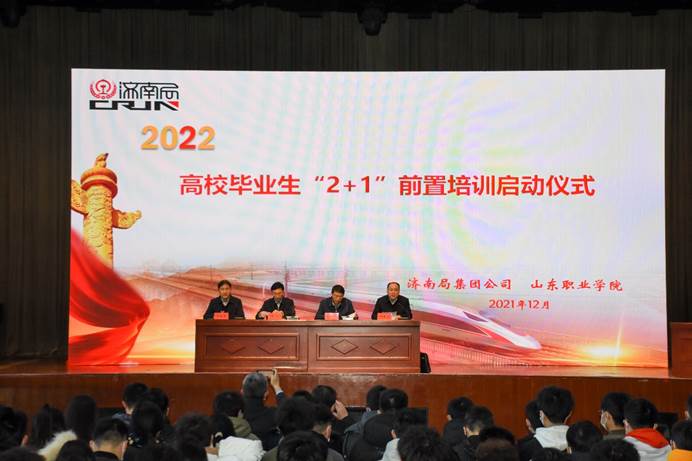 12月7日,中國鐵路濟南局集團有限公司2022年高職畢業生“2+1”前置培訓啟動儀式在山東職業學院南益館舉行。濟南鐵路局集團公司人事部(黨委組織部)主任(部長)薛義,職工培訓部主任張賀年,團委書記胡述沛,人事部(黨委組織部)副主任(副部長)杜春虎,黨校企業管理教研室主任、副教授趙祥剛,學校副院長王紹軍出席此次活動。