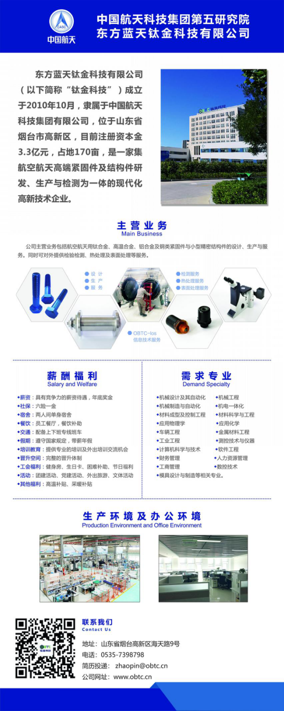 中國航天科技集團第五研究院東方藍天鈦金科技有限公司招聘簡章