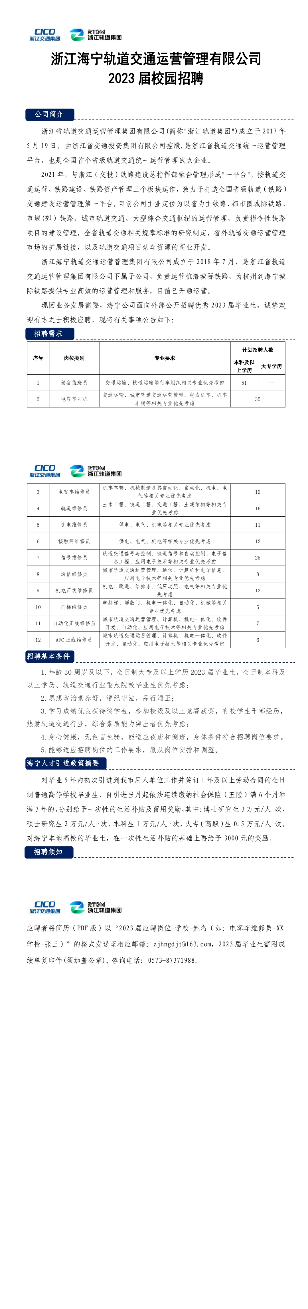 浙江海寧軌道交通運營管理有限公司2023屆校園招聘