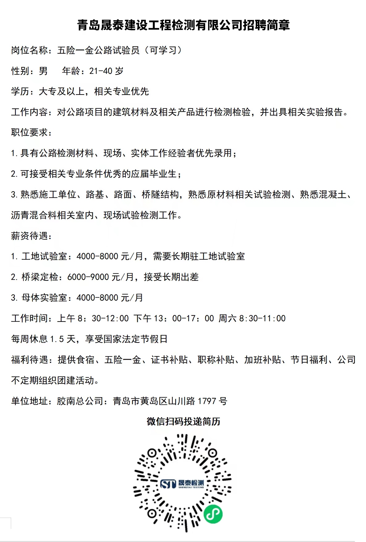 青島晟泰建設工程檢測有限公司招聘簡章