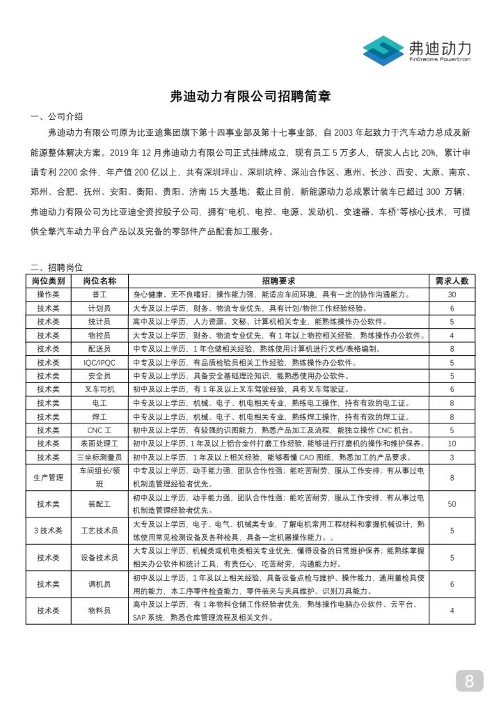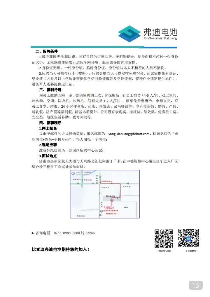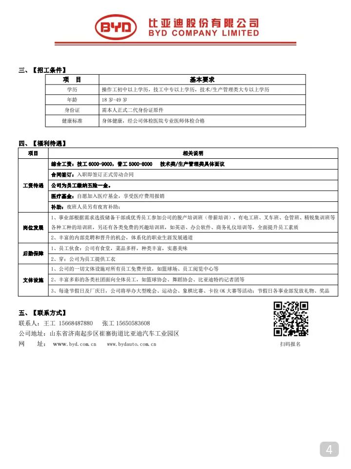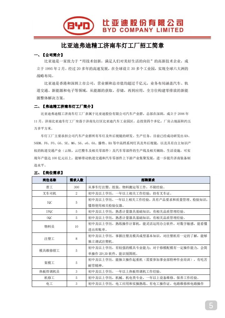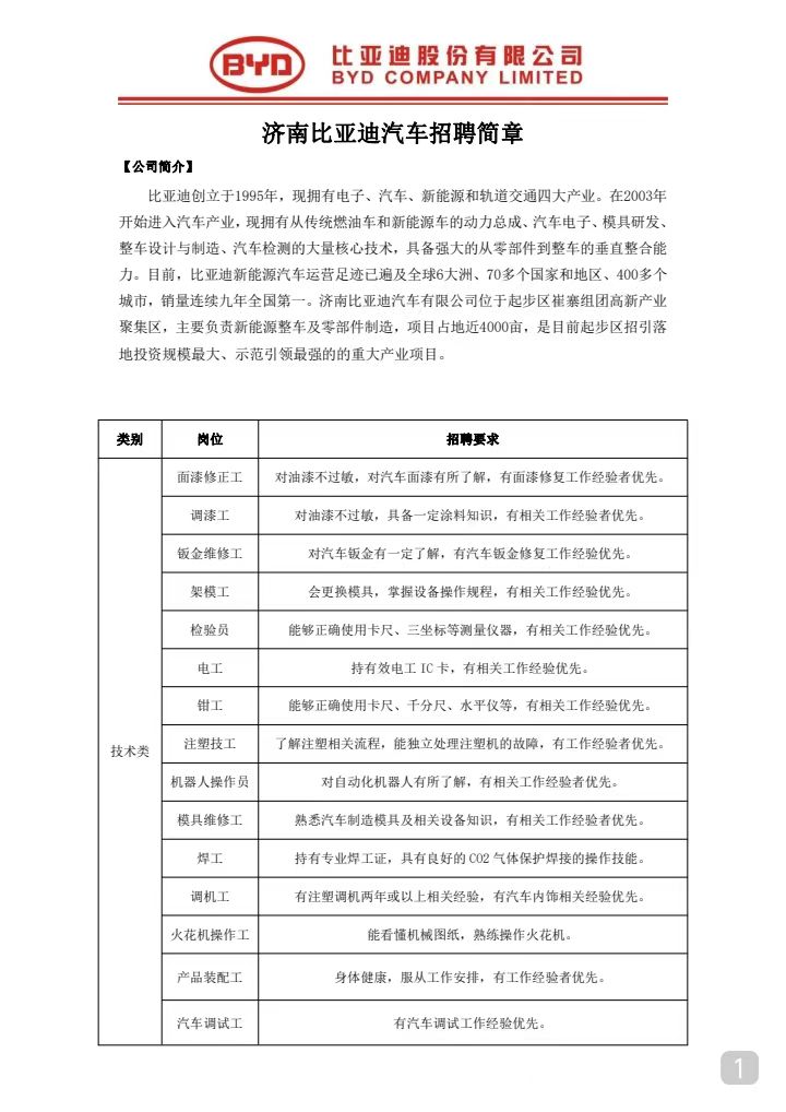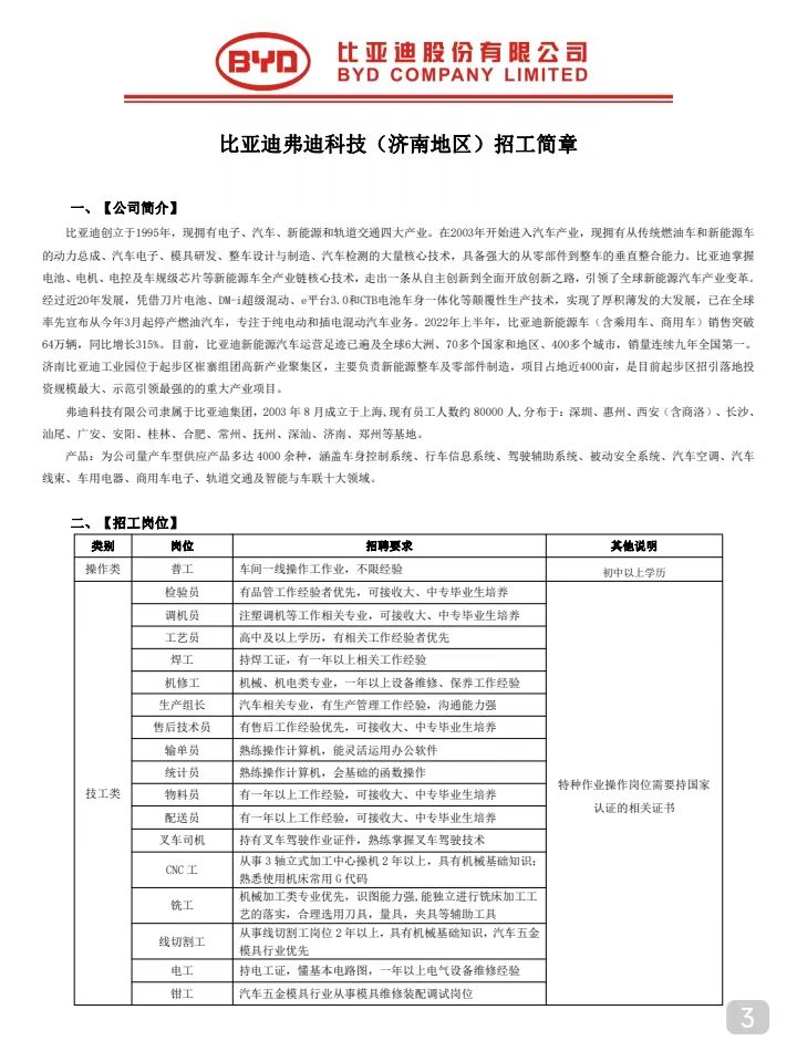 比亞迪股份有限公司(濟南)招聘簡章