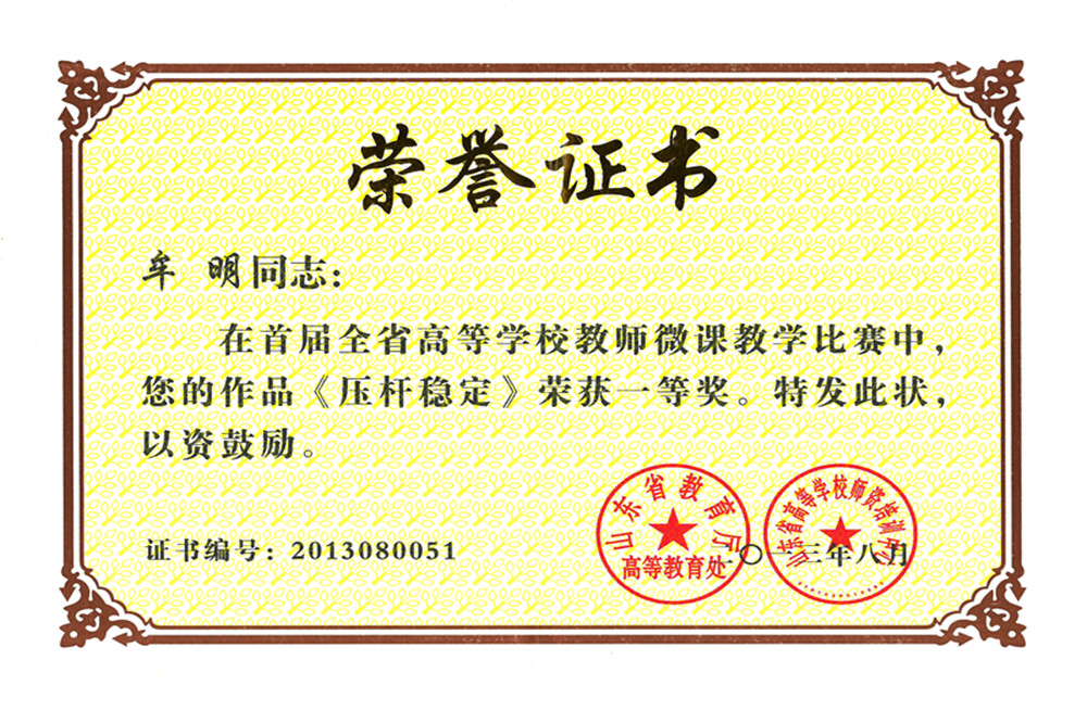 2014年初,全國高校教師網絡培訓工作會暨首屆全國高校微課教學比賽頒獎會在北京隆重召開,會議同時發布了《中國高校微課研究報告》。我院土木工程系牟明教授的微課《壓桿穩定》在獲得首屆山東省高校教師微課教學比賽一等獎之后,又獲得了首屆全國高校微課教學比賽二等獎(為山東省高職院校最高獎之一),其微課文章《一刻鐘引發的思考》被《中國高校微課研究報告》第二、四章引用。
