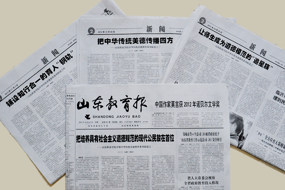 近年來,山東職業學院在強化大學生知識技能教育的同時,注重文化育人、美德育人,通過開展了一系列豐富多彩、富有成效的美德教育活動,著力加強中華傳統美德教育,大力弘揚和培育以愛國主義為核心的偉大民族精神,積極推進社會主義核心價值體系建設,不斷提升大學生的思想道德品質和人文素養。 山東教育報作為立足前沿闡釋政策傳播信息推廣經驗輿論引導教育事業發展,貼近實際關注熱點剖析難點傳遞心聲真情謳歌教書育人楷模的省內綜合類教育專業報紙,曾多期報道我院的建設成果、育人進程等。日前,該報更是分《把培養具有社會主義道德模范的現代公民放在首位》、《讓師生成為道德模范的“追星族”》、《把中華傳統美德傳播四方》、《鋪設知行合一的育人“鋼軌”》等四個專題針對山東職業學院富有成效的中華傳統美德教育進行了系列報道。