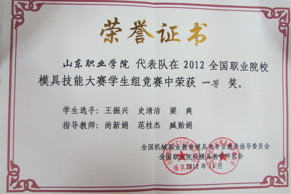 2012年11月23日-25日,全國職業院校模具技能大賽在天津輕工職業技術學院舉行,共有來自全國各地的31個代表隊參加。經過2天的緊張角逐,我院代表隊斬獲大賽一等獎好成績,同時,這也是繼去年參加此項賽事獲得三等獎后又一殊榮。