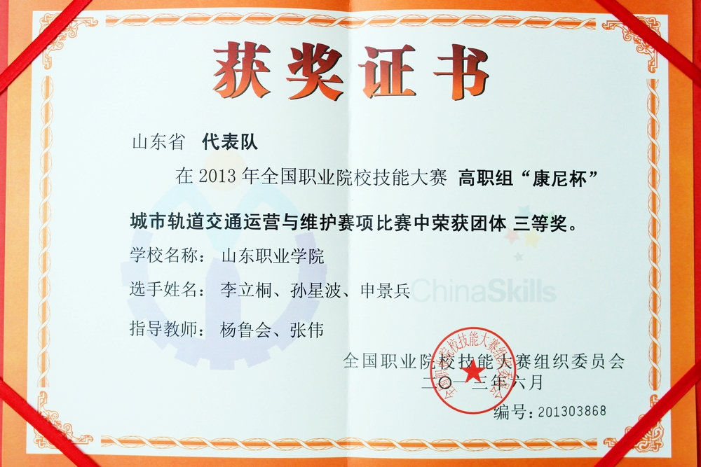 城市軌道交通運營與維護賽項是軌道交通類專業第一次全國性職業技能大賽,有來自全國18個省、直轄市的26支高職院校代表隊近200多名師生參加。山東職業學院代表山東省參加了該賽項。在領隊山東職業學院軌道交通學院副院長吳書鋒和指導老師楊魯會、張偉的帶領下,參賽選手李立桐、孫星波、申景兵憑借扎實的基本功底和較好的臨場發揮取得第十名好成績,榮獲本賽項三等獎,為學院爭得了榮譽。
