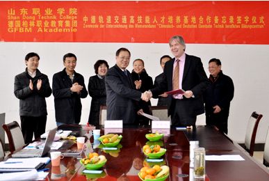 2012年3月16日下午,鐵道部勞衛司職教處處長任天德及副處長韓鈞在濟南鐵路局職教處處長仇世進、副處長侯萬仲等人的陪同下,來到山東職業學院軌道交通綜合實訓基地進行調研、指導工作。鄧洪基院長表示,此次與福格臧先生攜手簽署中德合作備忘錄,不僅為“中德軌道交通高技能人才培養基地”建設項目達成了初步合作意向,同時也期待著在接下來的合作詳談中能夠進一步深化合作方案,明確合作任務,制定詳細計劃,務實高效地推進國際間的校企交流合作,通過雙方的共同努力,將該基地建設成具有德國職業元素、集“人才培養、職工培訓、技能鑒定、技術服務”四位一體的、在全國具有重要影響力的培養高技能人才的示范基地。