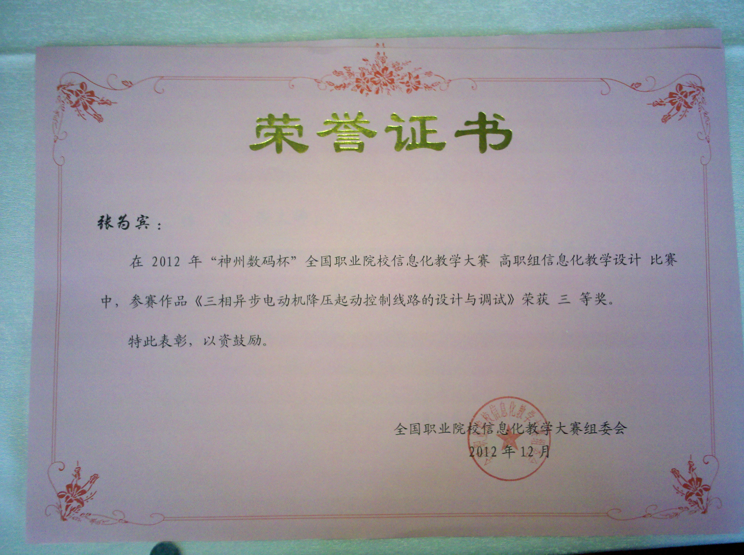 2012年12年7日至2012年12月10日,2012年“神州數碼杯”全國職業院校信息化教學大賽在南京高等職業技術學校舉行,本次大賽由教育部職業教育與成人教育司、工業和信息化部人事教育司和江蘇省教育廳共同組織。機電裝備系老師張為賓代表我院參加了此次比賽,參賽作品是《三相異步電動機降壓起動控制線路的設計與調試》,并憑借色的現場解說及答辯,最終獲得了三等獎。