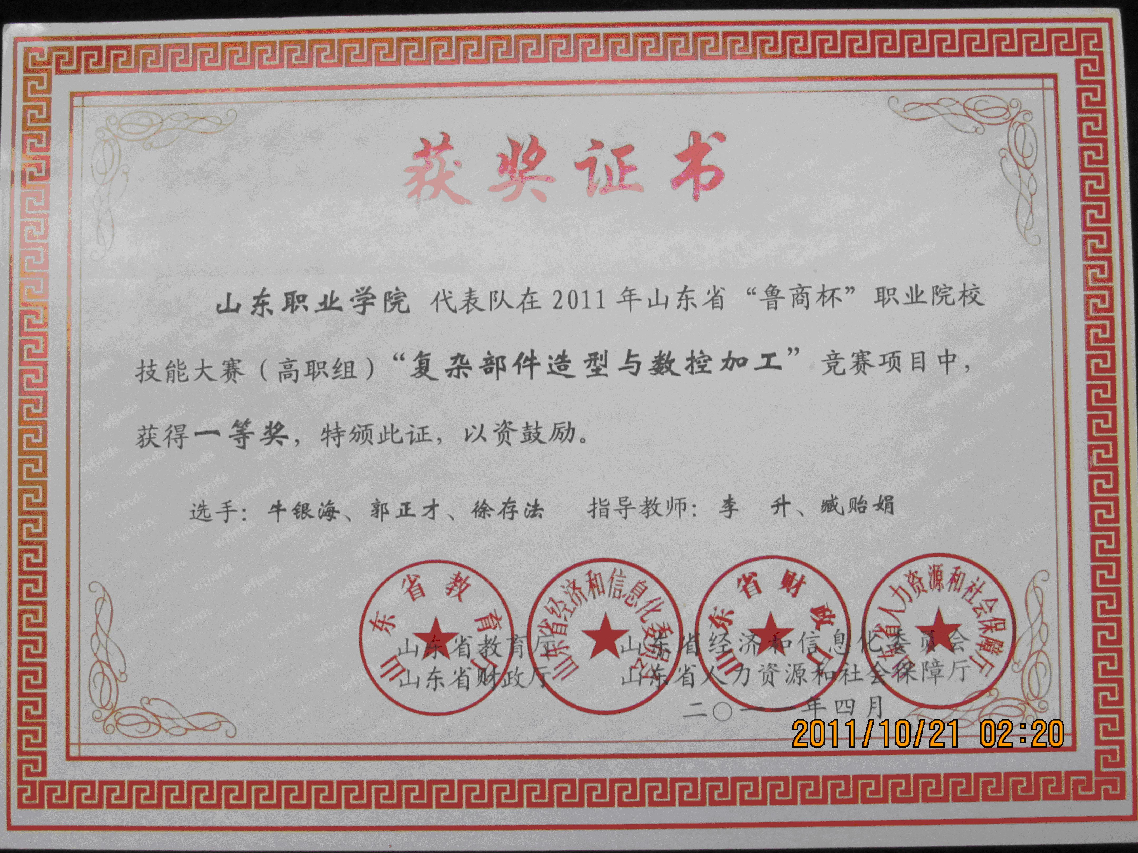 2011年4月15日至22日,在2011年“魯商杯”山東省職業院校技能大賽高職組競賽中,我系派出參賽隊參加“復雜部件造型與數控加工”、“注塑模具CAD與加工裝配” 項目競賽。比賽中,我系選手高水平發揮,充分體現了“練就一流技能,贏得精彩人生”大賽主旨。最終,由指導教師李升、臧貽娟,學生牛銀海、郭正才、徐存法組成的參賽隊伍獲《復雜部件造型與數控加工》項目競賽一等獎;由指導教師于延軍、尚新娟,學生李會、楊加太、王崇展組成的參賽隊伍獲《注塑模具CAD與加工裝配》項目競賽一等獎。