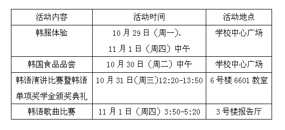 為營造更加濃厚的韓語學習氛圍,提高學生們學習韓語的積極性,讓全校師生領略韓國文化,體驗一場精彩絕倫的文化盛筵,2012年10月29日-11月1日,國際交流中心將舉辦以“交流·無限—體驗異國文化,展現自我風采”為主題的山東職業學院第一屆“韓國文化節”活動。具體活動內容、時間及地點如下: