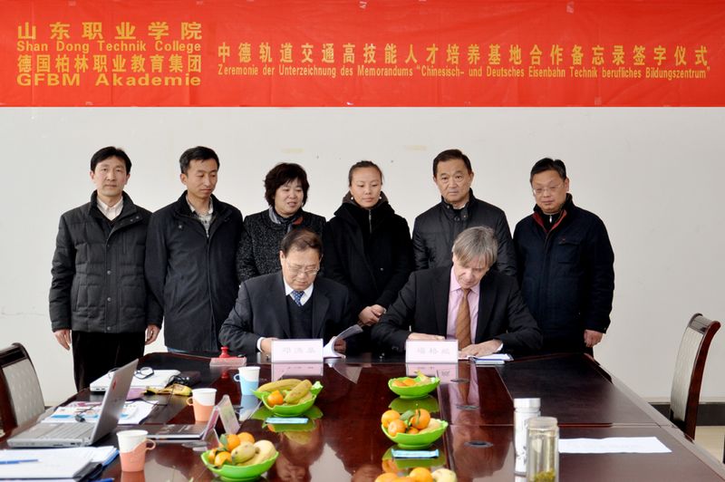 3月19日,中德軌道交通高技能人才培養基地合作備忘錄簽字儀式在山東職業學院舉行,學院院長鄧洪基與德國柏林職業教育集團董事會主席Vogelsang(福格臧)先生代表校企雙方攜手簽署合作備忘錄。柏林職業教育集團執行董事、柏林州政府_北京柏林友好城市框架下職業教育領域合作官方負責人、同濟大學中德職業技能認證研究中心項目研發負責人、柏林州教育資源有限公司董事長閆俊女士,國家科學技術部、中國駐奧地利/駐德國大使館原科技參贊陳文休先生,學院副院長祝瑞花,教務與科研處處長郭鵬,國際交流中心主任王輝,軌道交通系主任吳書鋒、副主任王紹軍出席簽字儀式。