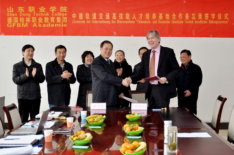 鄧洪基表示,此次與福格臧先生攜手簽署中德合作備忘錄,不僅為“中德軌道交通高技能人才培養基地”建設項目達成了初步合作意向,同時也期待著在接下來的合作詳談中能夠進一步深化合作方案,明確合作任務,制定詳細計劃,務實高效地推進國際間的校企交流合作,通過雙方的共同努力,將該基地建設成具有德國職業元素、集“人才培養、職工培訓、技能鑒定、技術服務”四位一體的、在全國具有重要影響力的培養高技能人才的示范基地。