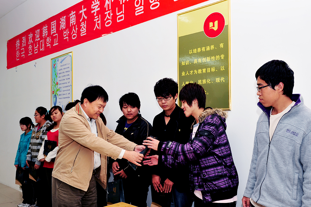馮院長首先與學院中韓合作班的老師及同學們進行見面會,在詳細了解了同學們的學習情況后,馮院長代表韓方向同學們贈送了學習書籍和禮品,鼓勵同學們在今后的學習中要更加努力,更加積極。