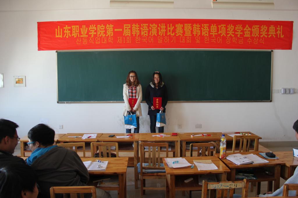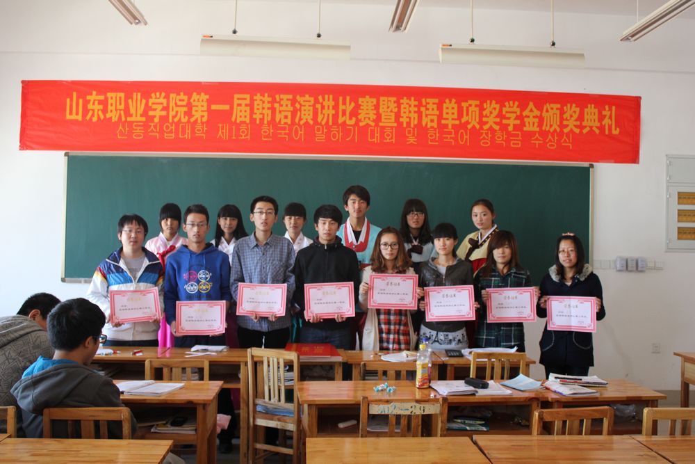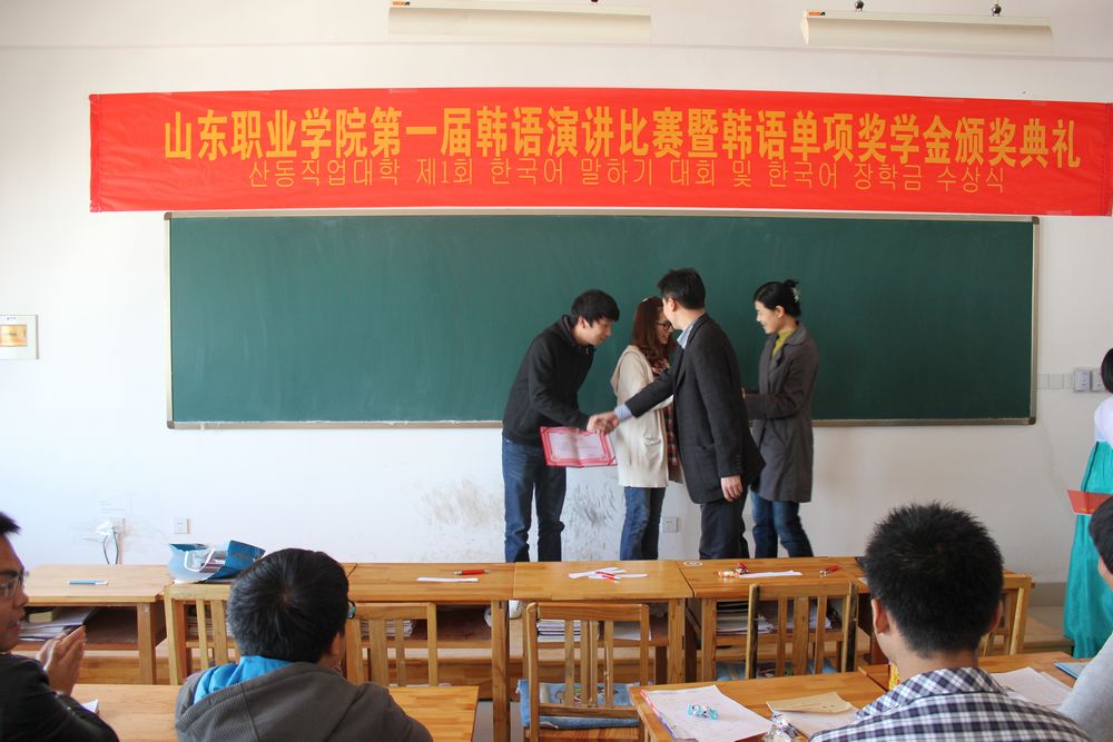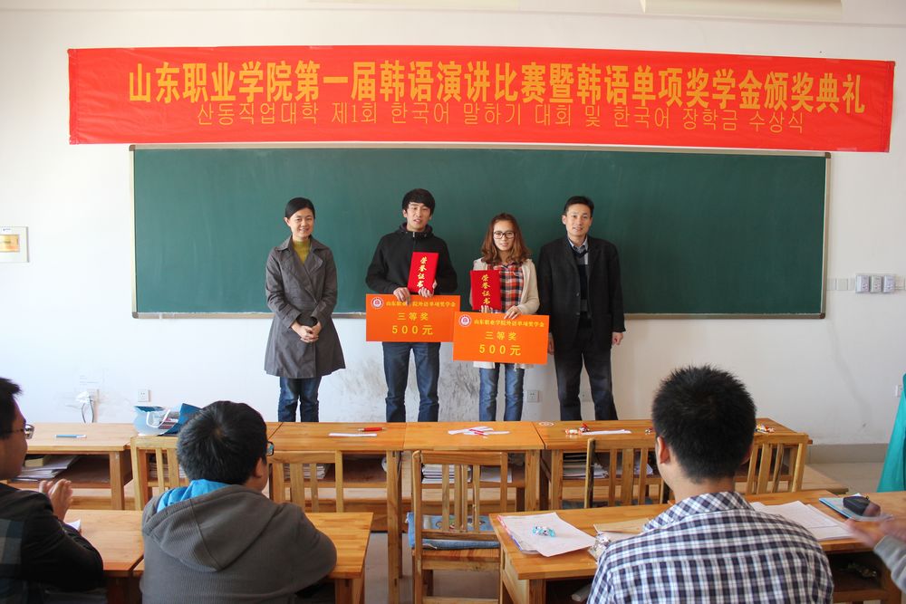 演講比賽結束后,舉行了山東職業學院韓語單項獎學金頒獎典禮。教務處副處長張守忠、張欣作為頒獎嘉賓,為獲得韓語單項獎學金的學生們頒了獎。