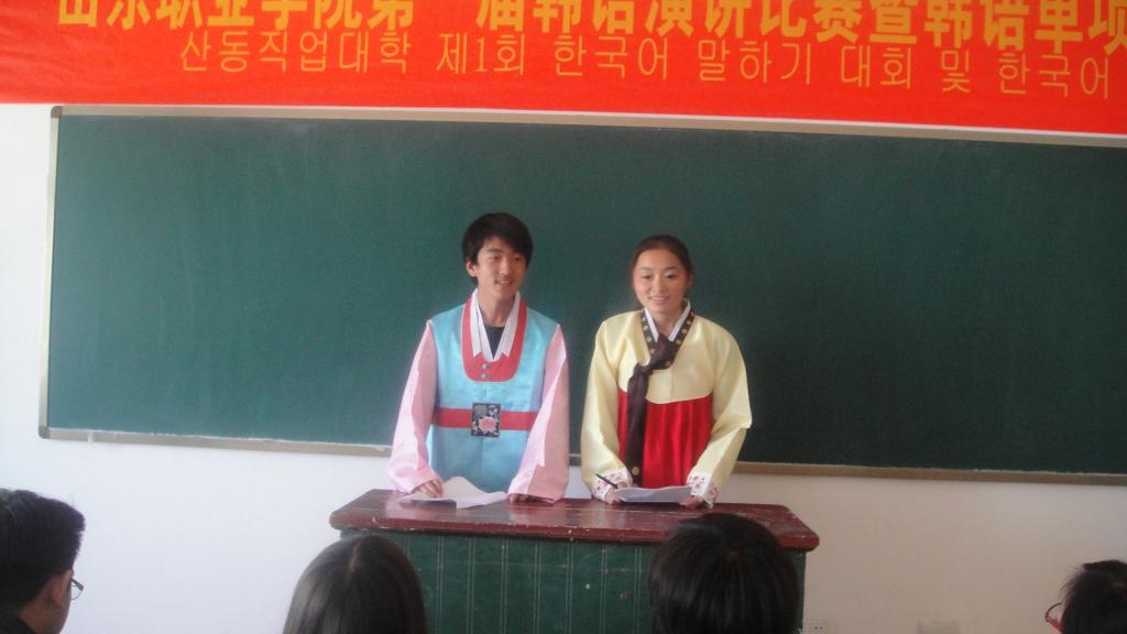 韓語演講比賽由國際交流中心李彥、莊婷、郭經偉老師,以及有韓國留學經歷的李林林、榮映菡老師擔任評委。中韓班大二學生8名、大三學生1名,共9名選手參加了比賽。雖然決大部分選手是大二學生,僅學習了不到兩個半學期的韓語,但是學生們積極準備,展示了自己的韓語水平,展現了良好的精神面貌,讓我們看出了他們的努力,看到了中韓班學子的風采。