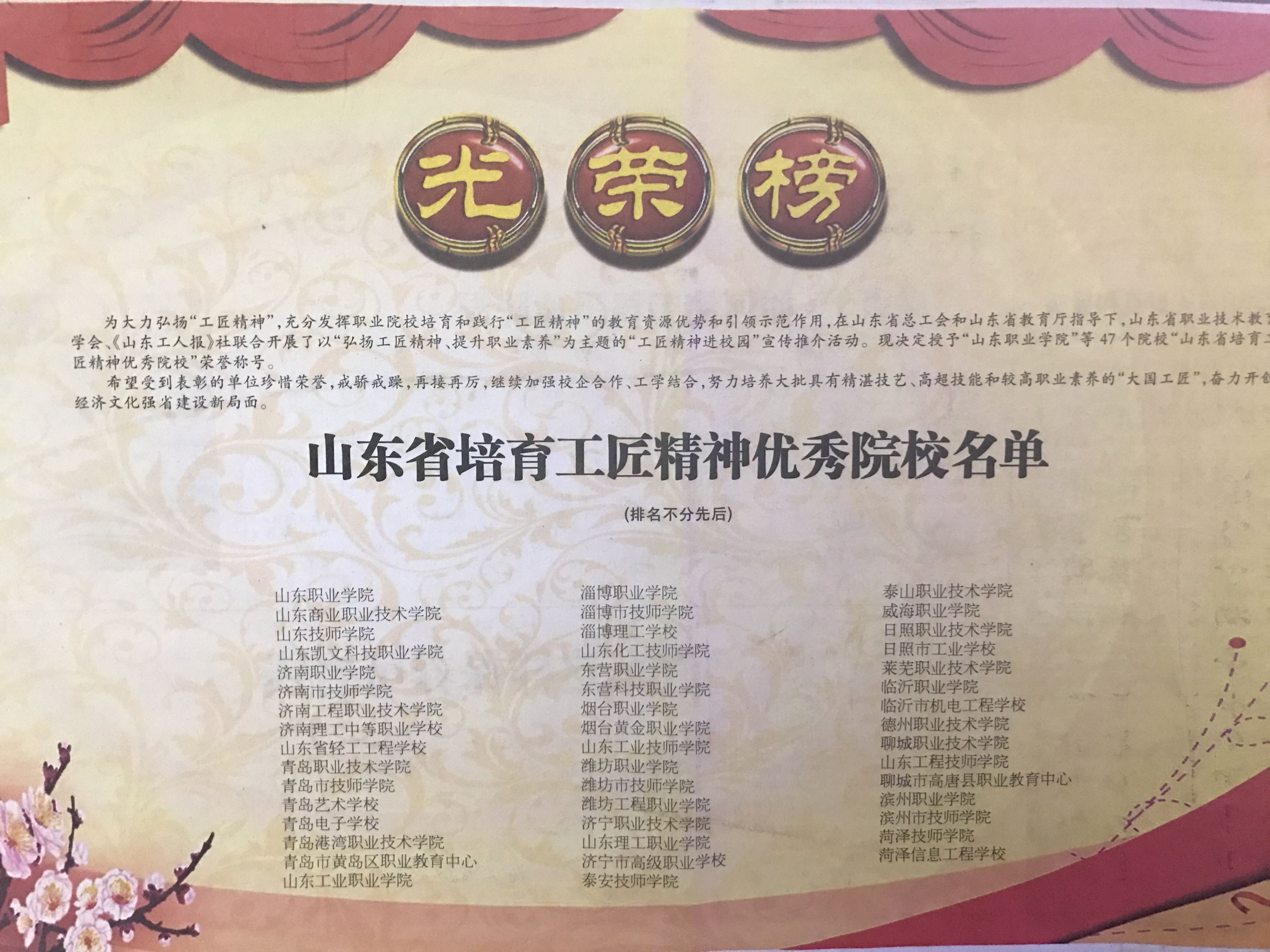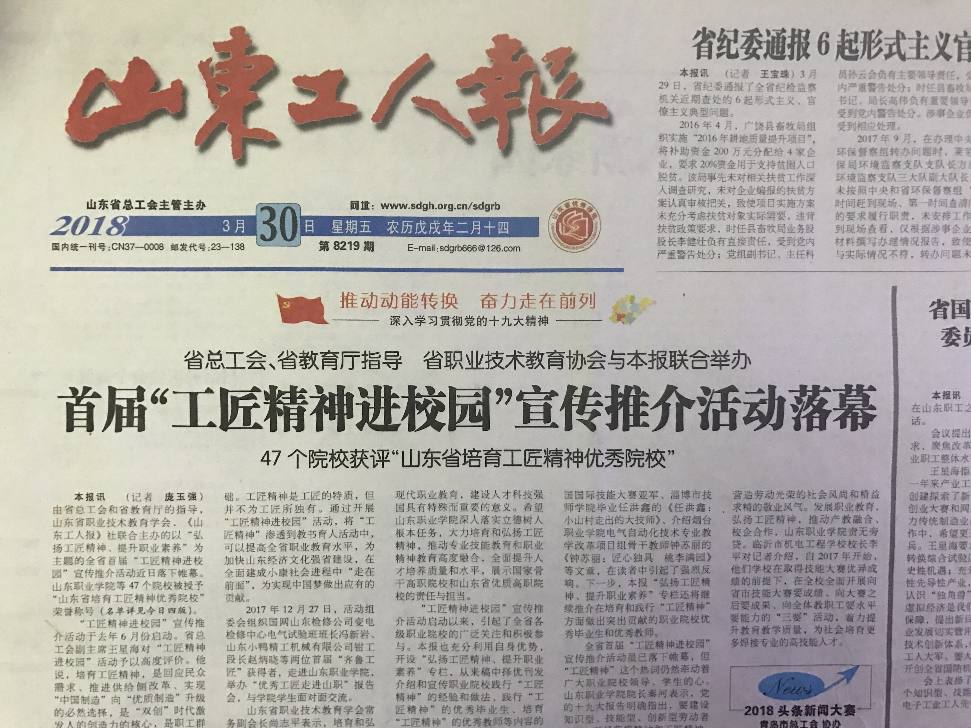 近日,由省總工會和省教育廳指導,山東省職業技術教育學會、《山東工人報》社聯合主辦的以“弘揚工匠精神、提升職業素養”為主題的全省首屆“工匠精神進校園”宣傳推介活動近日落下帷幕。我院等47個院校被授予“山東省培育工匠精神優秀院校”榮譽稱號。
