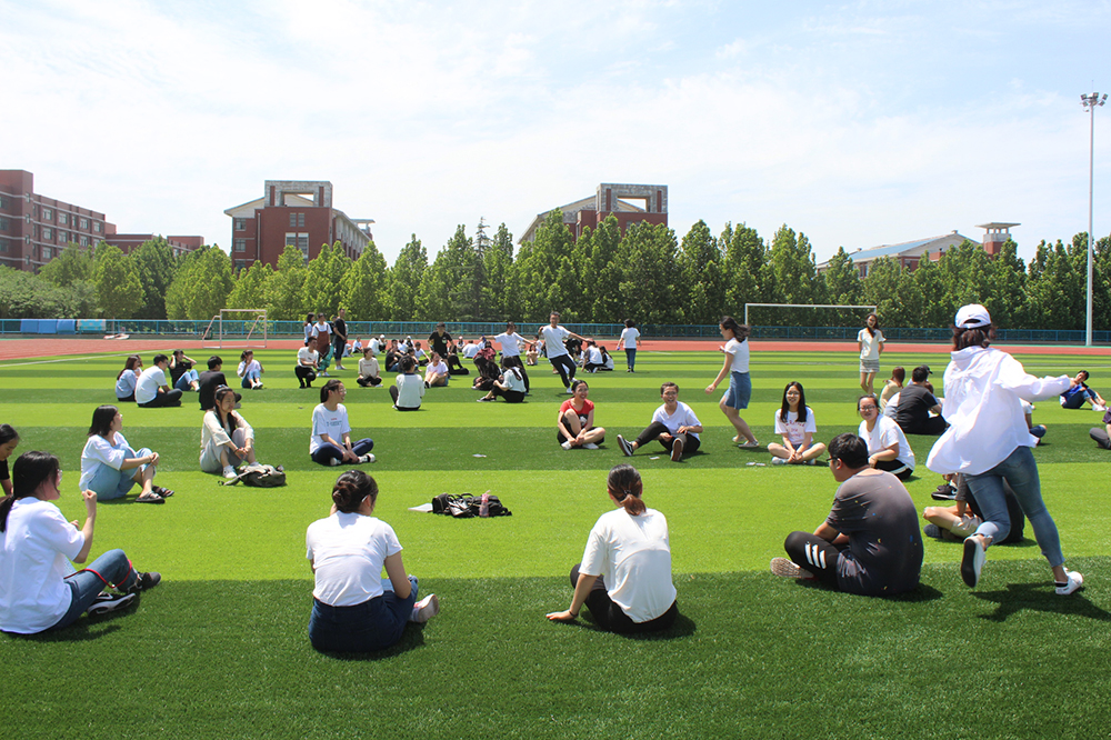 范秀菊老師主持游戲活動。在“蘿卜蹲”熱身活動后,同學們分組在操場上圍成一個個圓圈,開始了老鷹捉小雞、丟手絹、扔沙包、接力穿圈等趣味游戲。游戲中,同學們左撲右閃,你追我趕,操場上傳來陣陣歡笑聲與吶喊聲。接力穿圈環節中,雖然同學的動作靈活度不一,但同學之間相互激勵、相互協作,都順利完成接力游戲。整個活動氣氛活躍,精彩紛呈,同學們在歡聲笑語中放飛心靈,釋放壓力。