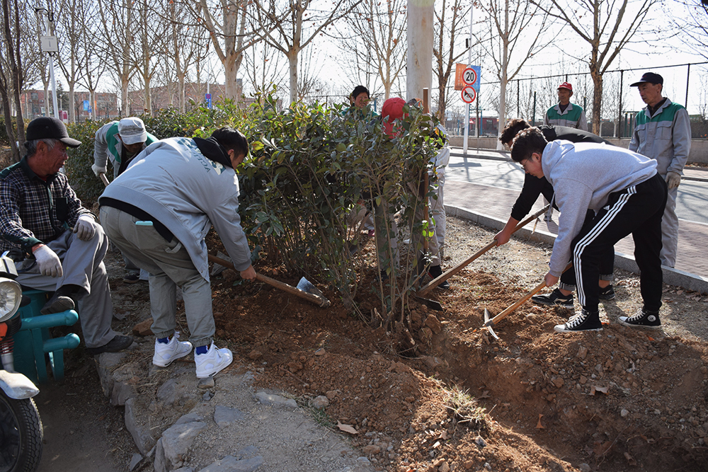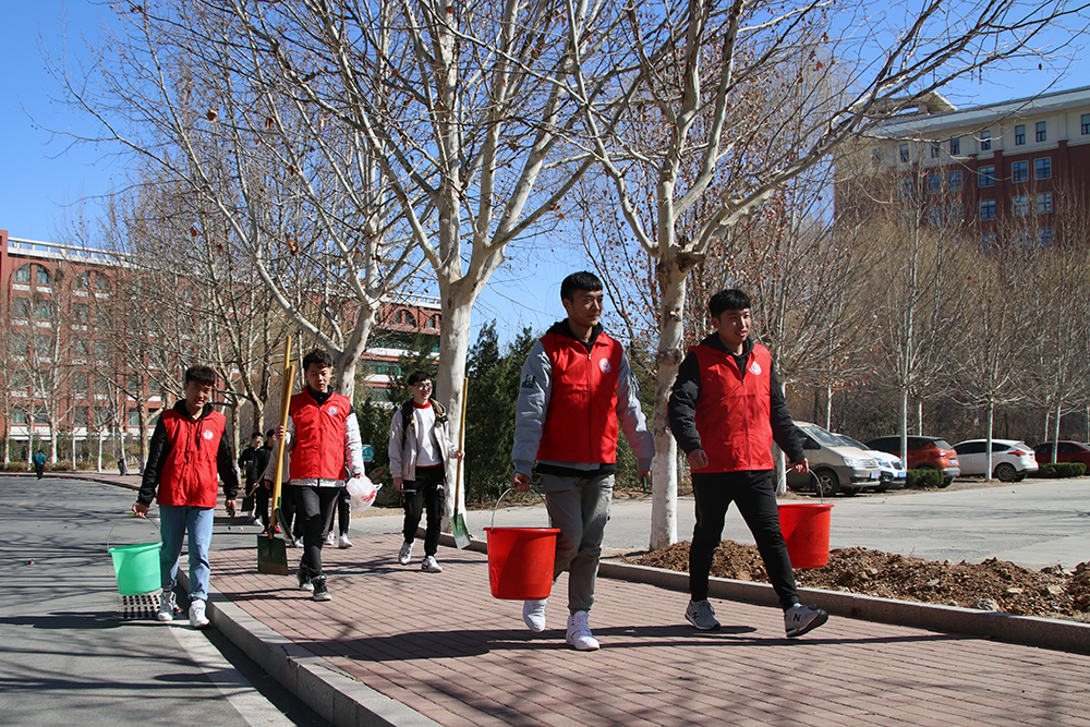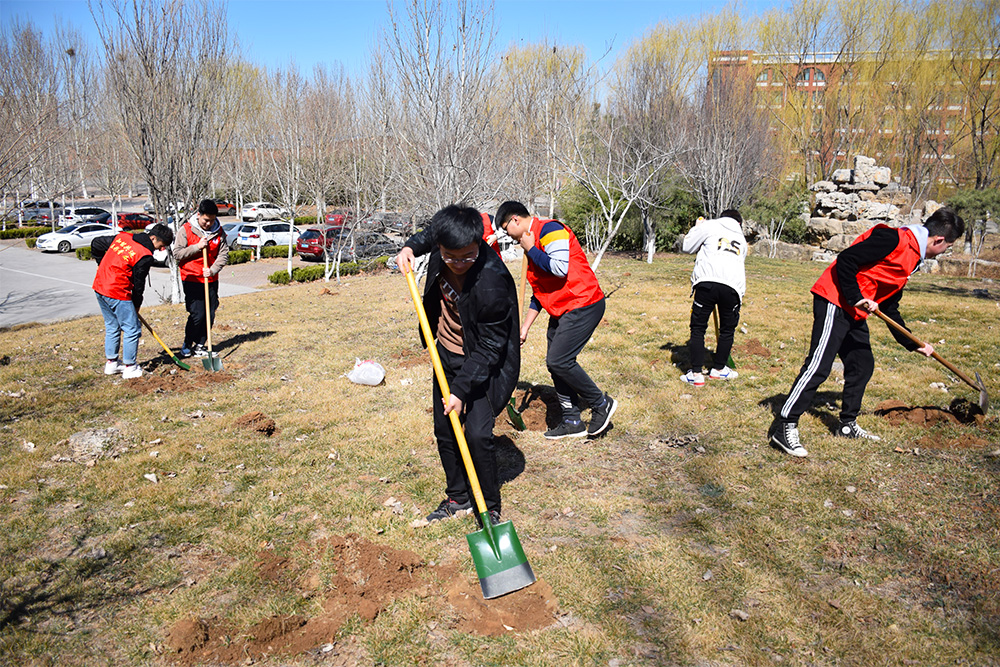 學生黨員、入黨積極分子及部分學生組成志愿者小隊,來到學院中待建的綠化帶配合環衛工人進行樹苗栽種工作。現場氛圍熱火朝天,大家擼起袖子拿起鐵鍬、鐵鎬刨樹坑、鏟泥巴,將一棵棵小樹苗栽種下去。每一個樹坑的挖掘、每一棵樹苗的栽種、每一鏟泥土的填充、每一盆水的澆灌,都是希望的播種、真情的見證。植樹過程中,志愿者們不時與綠化工人交流植樹護林的方法技巧,了解綠植的生長習性。在熱鬧歡快的氛圍中,大家在植樹中揮灑汗水,享受著勞動帶來的滿足感,他們與新栽種的樹苗融為一體,成為一道靚麗的風景線。經過大家的共同努力,裸露的黃土地上一株株蓊蓊郁郁的綠植落地生根,植樹環節圓滿完成。