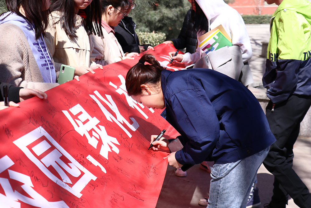 簽名儀式上,志愿者們高舉植樹節宣傳橫幅,為同學們普及保護綠植方法,宣講綠色發展理念,傳遞綠色環保觀念。前來圍觀的同學們認真傾聽志愿者們的講解,在橫幅上簽下自己的姓名,以示自己保護環境的堅定信念。志愿者們為建設綠色山職院添磚加瓦,對綠化校園、美化環境做出了巨大貢獻,彰顯了我系學子積極向上的精神風貌。