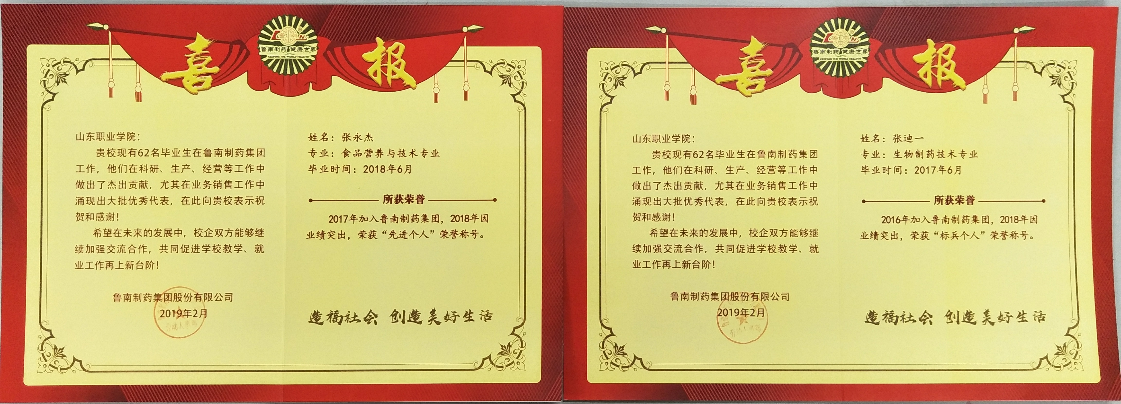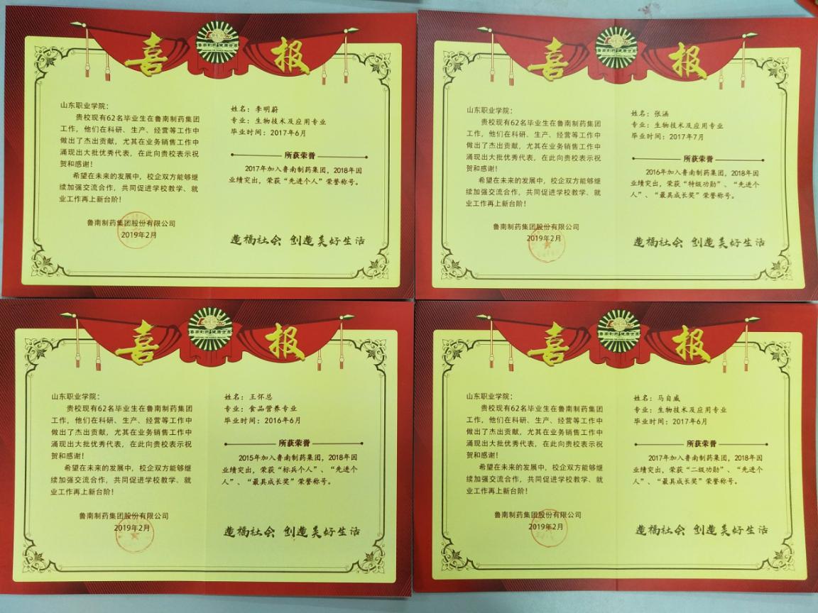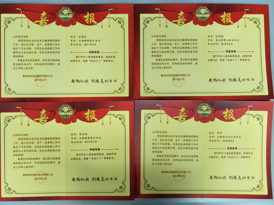 繼去年收到魯南制藥集團對我院生物工程系六名畢業生的喜報后,今年再次收到魯南制藥集團發來的多份喜報。我院畢業生張涵、馬自威、王懷總、張迪一、史國良等10名畢業生工作努力、業績突出,尤其在銷售業務中表現優秀,分別獲得了企業頒發的“特級功勛”、“二級功勛”、“標兵個人”、“先進個人”、“最具成長獎”等多項榮譽。