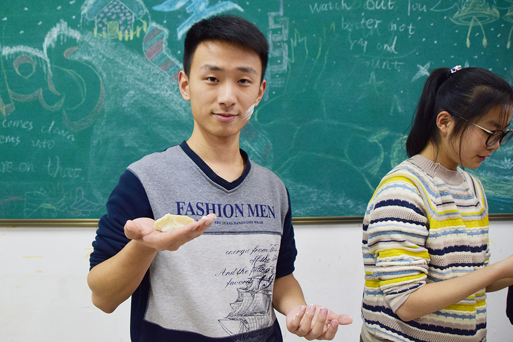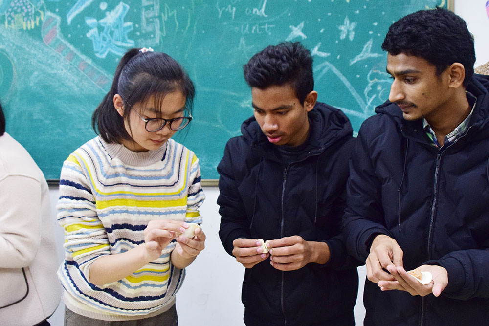調餡兒、搟皮兒、包餃子、煮餃子……一系列流程有條不紊,氣氛活躍,熱情洋溢。范媛媛老師為外國友人講解中國餃子文化,李井銘老師與同學們暢談節日傳統,薛高芳老師細心指導包餃子技巧,大家全身心地投入到活動中,感受節日溫暖,享受集體溫馨。