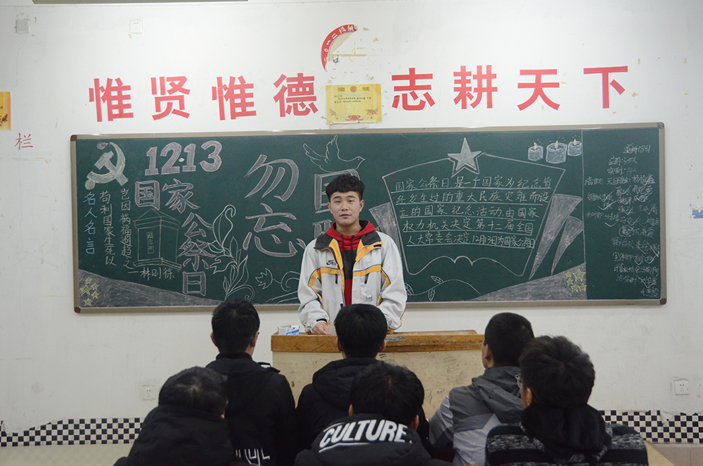 12月13日,鐵道工程與土木工程系舉辦了“銘記歷史,勿忘國恥”的主題班會。各班通過演講、黑板報、PPT等多種形式帶領大家回顧了中國人民那段恥辱悲慘的歲月,圍繞“我們不忘這段慘痛歷史是為了什么”“ 我們該以怎樣的實際行動來維護和平”這兩個話題展開積極討論。