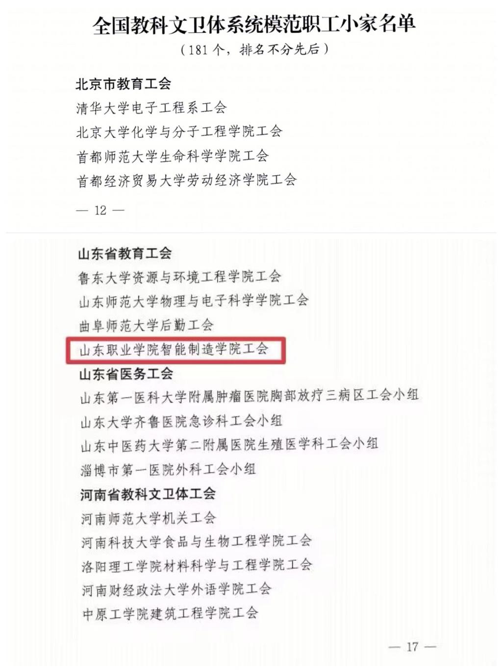 近日,中國教科文衛體工會全國委員會下發《關于確認全國教科文衛體系統模范職工之家、模范職工小家的通知》,我校智能制造學院工會被授予“模范職工小家”榮譽稱號,這是智能制造學院工會繼“山東省教育系統模范職工小家”稱號之后獲得的又一項更高級別的榮譽。