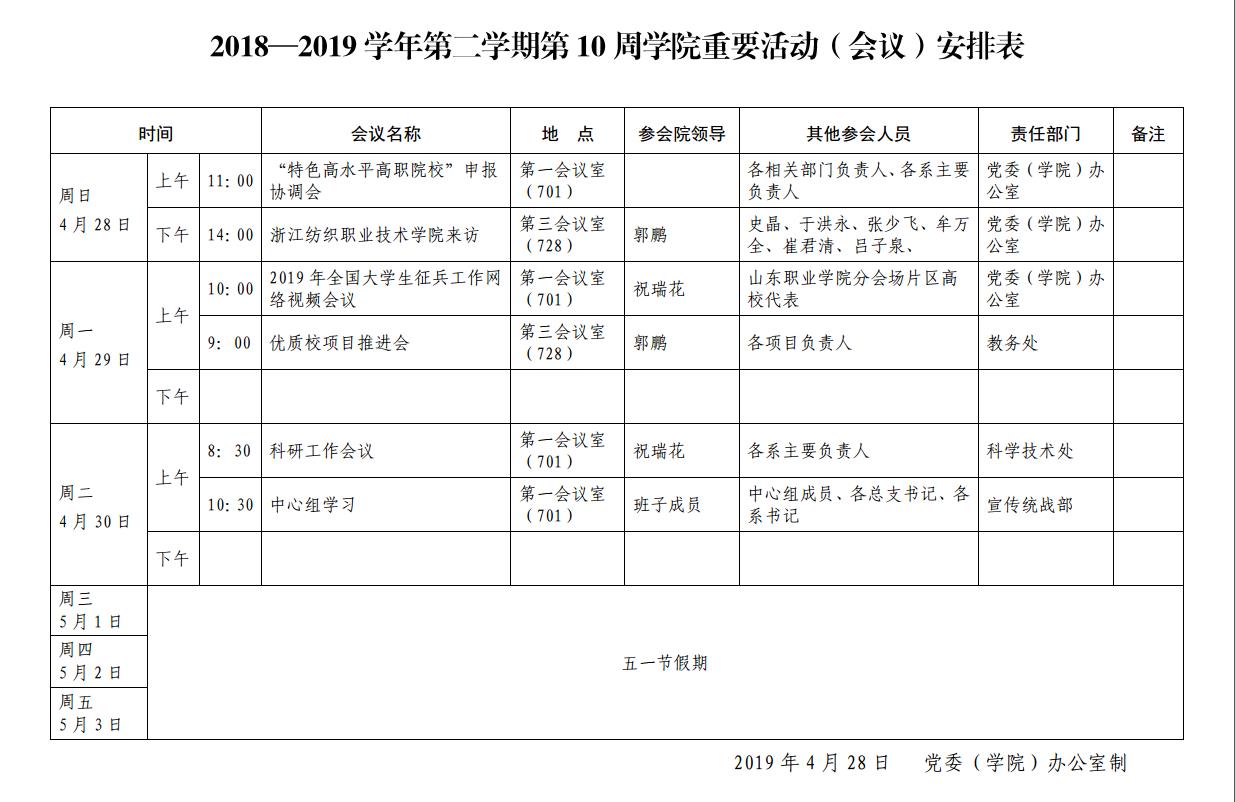 2018-2019學年第二學期第10周學院重要活動(會議)安排表