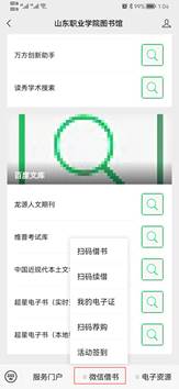 如:點擊“微信借書”,可以在圖書館書庫、圖書館一樓大廳及餐廳自主進行掃碼借書和掃碼續借。
