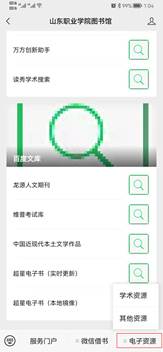 6.“電子資源”,訪問所需要的電子資源,包括學術資源和其他資源兩個功能。