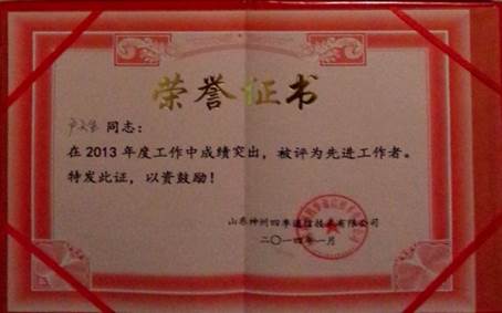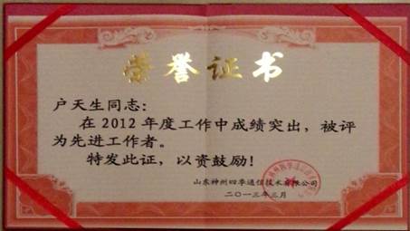戶天生同學2012年、2013年連續獲得公司先進工作者稱號