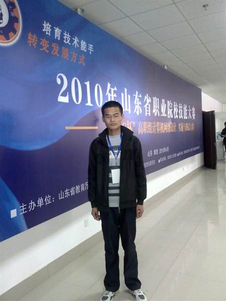 2010年他代表學校參加了山東省教育廳舉辦的山東省職業院校技能大賽獲得網絡設備調試組一等獎,并且被選拔參加2010年在天津舉辦的全國職業院校技能大賽,獲得三等獎,用自己所學的知識為學校爭得了榮譽。