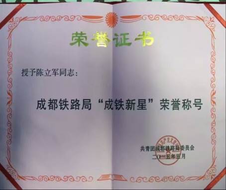 畢業以來,一直在高鐵現場發展,工作勤懇,敬業愛崗,不怕困難,面對難點迎難而上,在工作中表現出較強的職業素養,設備穩定無故障.2014年被評為段級“段級優秀共產黨員”,2015年獲得成都鐵路局“成鐵新星”榮譽稱號。