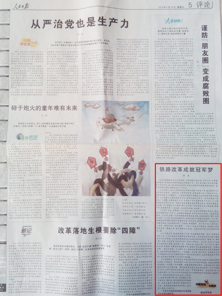 今年4月10日,人民日報刊登了他參加“中國道路中國夢 新改革故事”征文活動的文章《鐵路改革成就冠軍夢》。