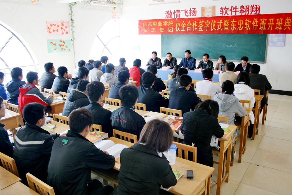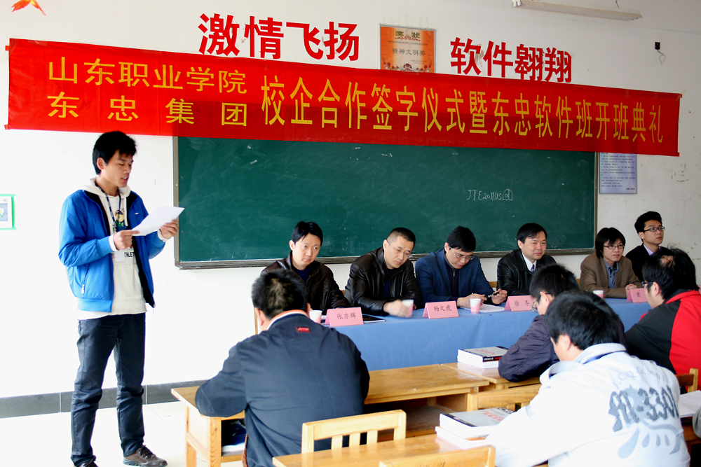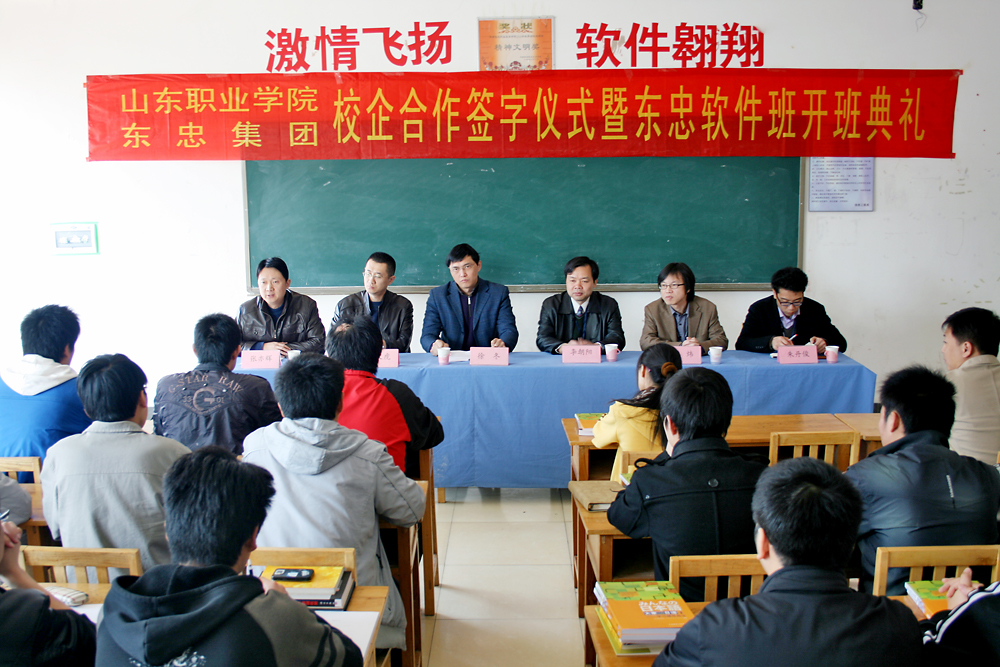 4月8日,山東職業學院信息工程系與東忠集團簽訂校企合作協議并舉行東忠軟件開班典禮。出席本次典禮的企業嘉賓有東忠集團杭州東忠科技有限公司總經理李朝陽;杭州東忠人才開發有限公司總經理黃煒;市場部經理朱丹俊。濟南東忠軟件有限公司培訓部左雷老師。山東職業學院副院長徐冬、信息工程系主任張亦輝、黨總支書記楊文虎、就業指導辦公室主任范友華,軟件技術專業教研室主任牛文琦、姜海嵐老師等出席慶典儀式。