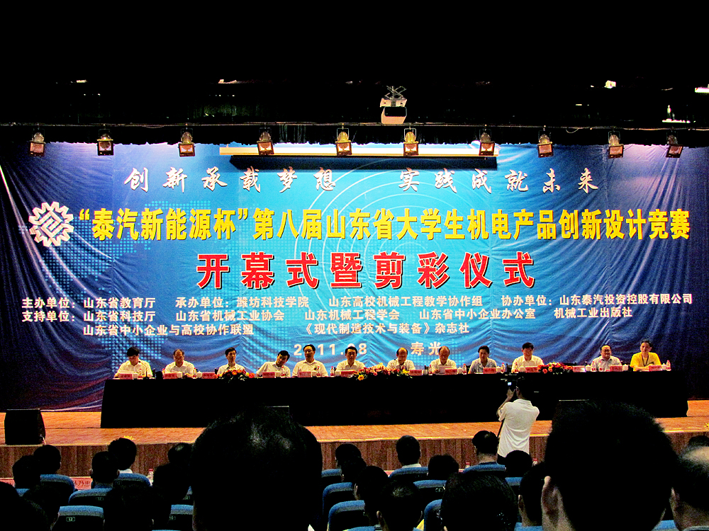 本次競賽由山東省教育廳主辦,濰坊科技學院、山東高校機械工程教學協作組承辦,山東省科技廳、山東省機械工業協會、山東機械工程學會、山東省中小企業辦公室、機械工業出版社等單位支持,全省高校共同參與的一次機電產品創新設計盛會,旨在增強省內高校大學生的創新意識、動手實踐能力和團隊協作精神,本次大賽圍繞“節能、低碳、綠色、健康”為主題,結合山東泰汽投資控股有限公司的發展需求,本著“創新承載夢想、實踐成就未來”的精神進行創新實踐活動,從全省73所高校2563件作品中推選出了 482件參加決賽。