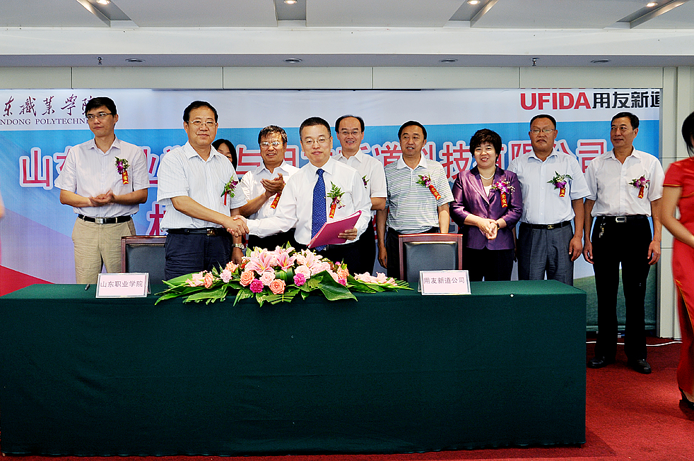 8月27日,山東職業學院與用友新道科技有限公司校企共建虛擬商業社會環境VBSE實習實訓基地簽約儀式在美麗的海港城市日照兗礦聖園酒店隆重舉行。山東職業學院黨委書記劉邦治為此次校企合作簽約儀式致賀詞。用友新道科技有限公司高級副總裁、北京市職業教育分級教學改革專家組成員馬德富先生、山東職業學院院長鄧洪基出席簽約儀式。簽約儀式由學院黨委副書記、常務副院長馬文卿主持。用友新道公司助理總裁兼院校事業部總經理宋健先生、山東分公司總經理于美玲、學院副院長徐冬、馬慶謂、祝瑞花、紀委書記祝介安、副院長焦見洋以及學院正科級以上中層干部為此次校企合作簽約儀式的隆重舉行作共同見證。