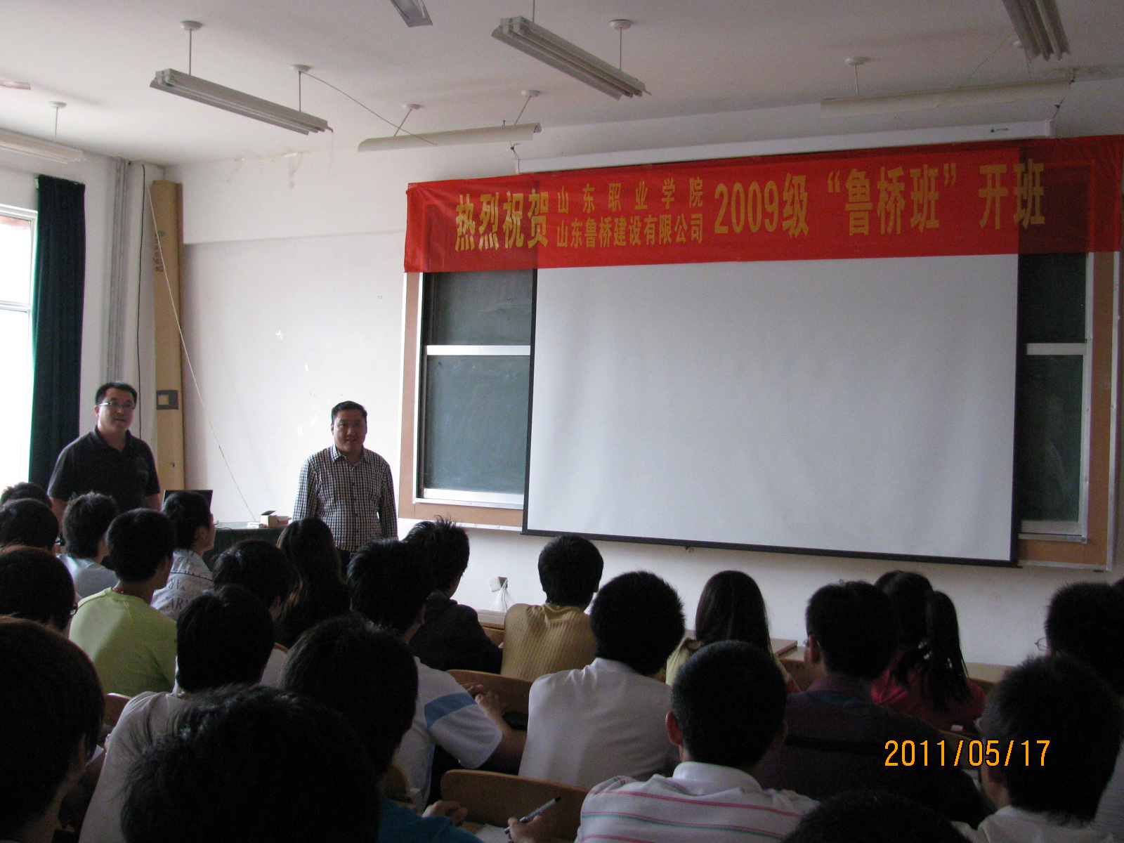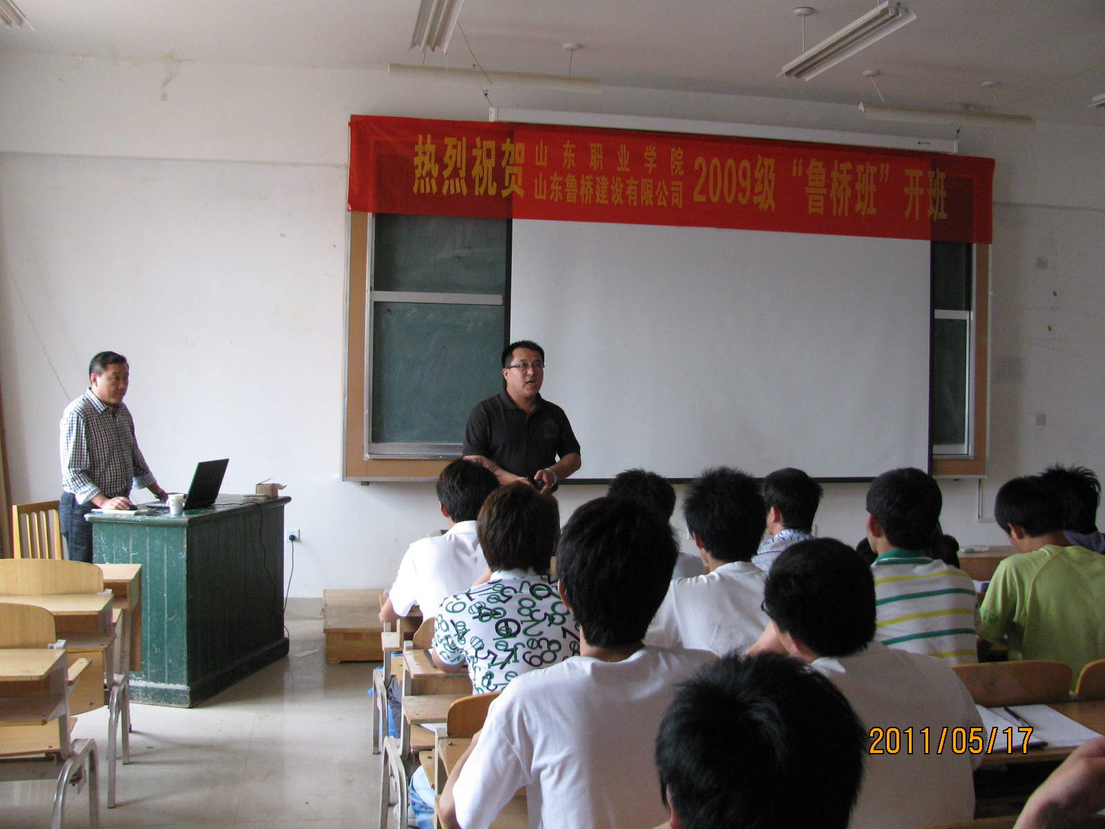 為進一步落實國家骨干院校人才培養方案,滿足企業對工程施工一線的用人需求,培養學生的職業素養和職業技能,加深校企合作交流,5月17日,山東魯橋建設有限公司訂單班——“魯橋班”隆重開班。山東魯橋建設有限公司工程部王經理、招生就業辦公室魏鵬主任參加了此次開班儀式,并由技術專家王經理擔任首次授課的主講教師。