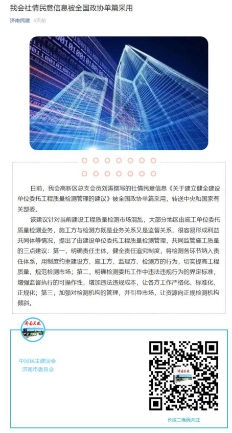 作為民主建國會會員,積極獻言建策是義不容辭的責任和義務。為此,他向民建濟南市委提出《關于建立健全“濟南市建設單位委托工程質量檢測管理”的建議》、《關于開放建工檢測行業審批用地、促進行業規范化、產業化發展的建議》等提案,提案都得到了各級主管部門重視,其中《關于建立健全“濟南市建設單位委托工程質量檢測管理”的建議》被全國政協單篇采用,并轉發有關部委。2018年,濟南市高新區市場監管局專門為他頒發“高新區政風行風監督員”。