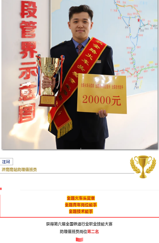 2019年,汪珂憑借日常積累的行車知識和對站場情況的掌握,以高分通過濟南南站車崗位后備人才選拔考試,成為該站調車轉崗行車職工中年紀最小的一個。他學用結合、勤學好問的工作態度他成為了濟南南站最年輕的調車轉崗行車職工。