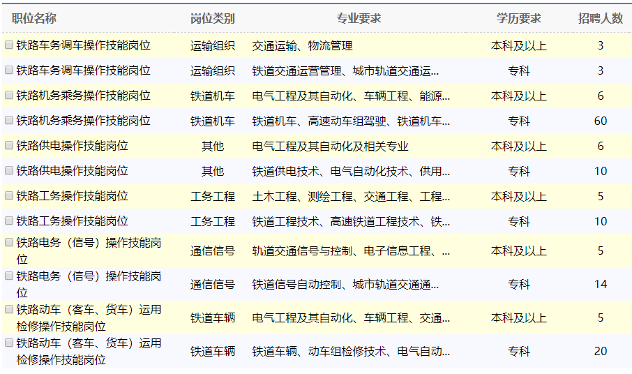 5.信息技術專業優先招聘生源和教學質量較好的高校畢業生,并進行專業能力測試。其他專業要求畢業生所學專業為鐵路專業方向,所學課程包含鐵路專業課程。