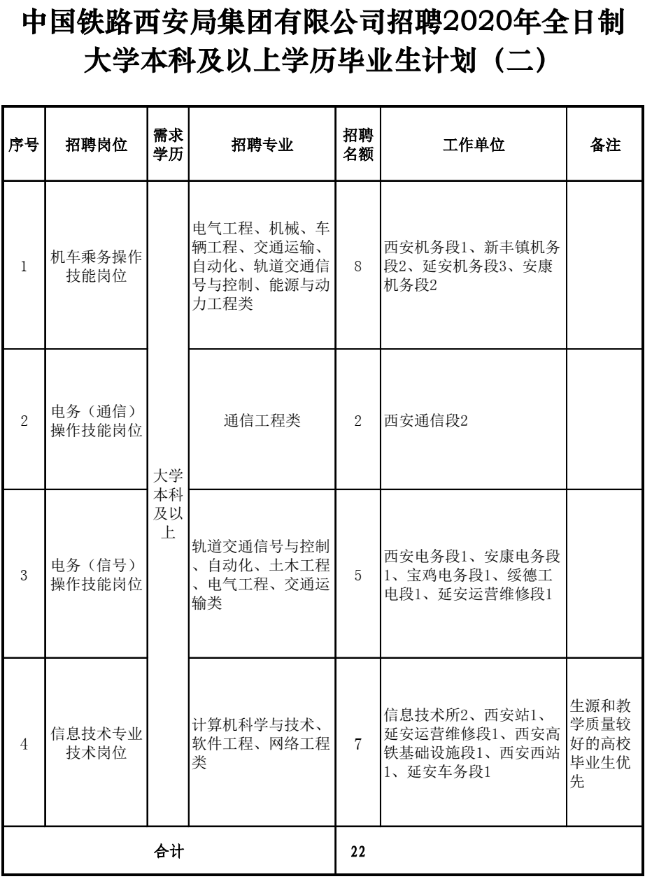 2.符合招聘崗位要求的專業條件,列入國家招生計劃、具備派遣資格,2020年和2019年畢業的全日制普通高等院校大專(高職)學歷畢業生。除崗位代碼為20023、20026、20028、20034外,其余招聘崗位必須在校期間所學專業為鐵路方向或所學主要課程中包含鐵路專業課程;