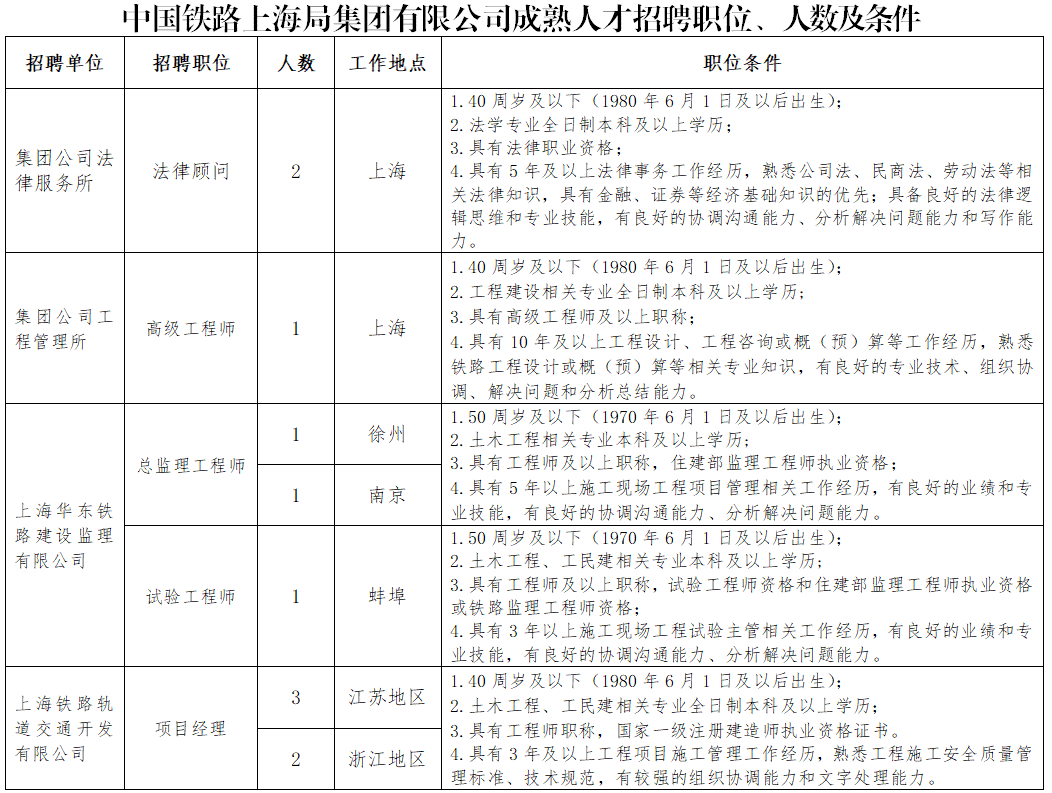 根據工作需要,中國鐵路上海局集團有限公司面向社會誠聘法律顧問、工程概(預)算管理、監理工程師、試驗工程師、工程項目管理等專業成熟人才,具體情況如下: