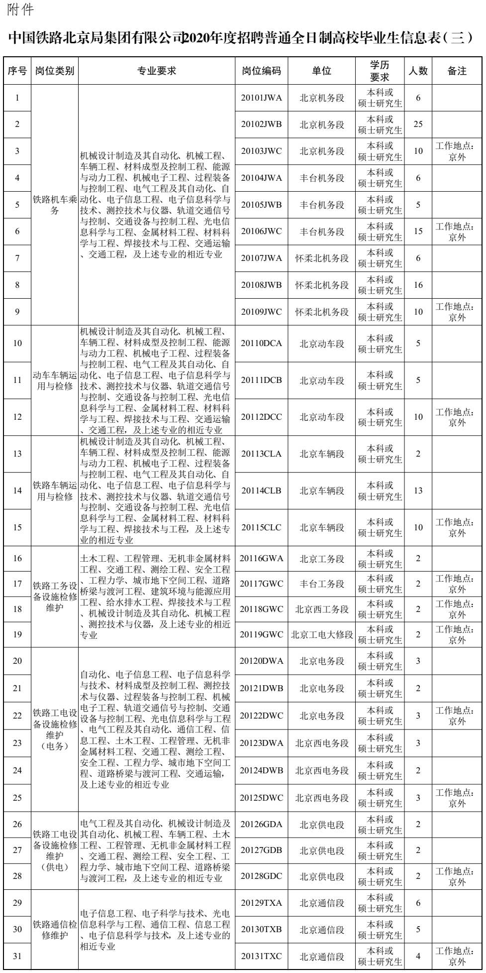 中國鐵路北京局集團有限公司2020年度招聘全日制普通高校畢業生公告(三)