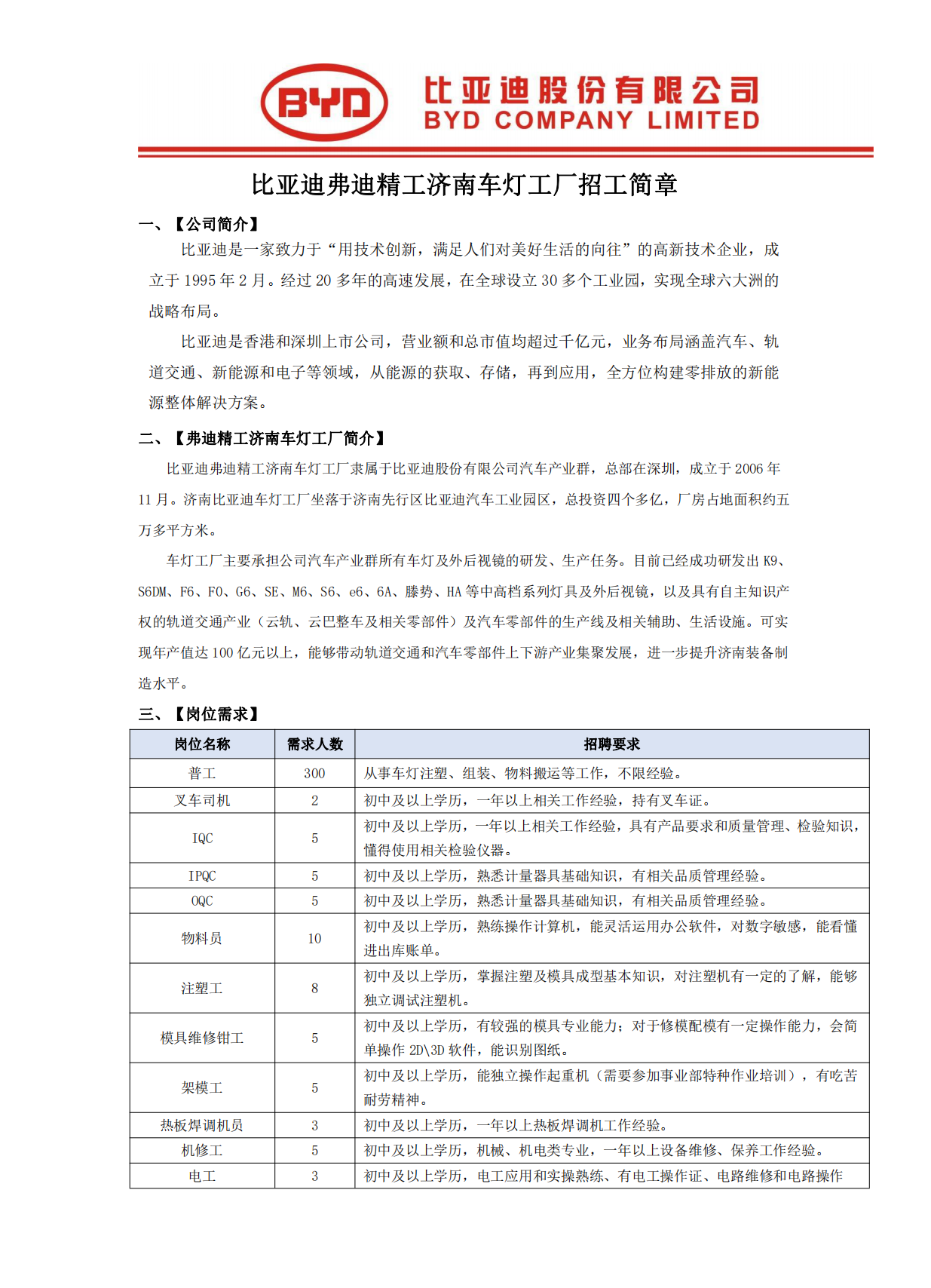 比亞迪弗迪精工濟南車燈工廠招工簡章
