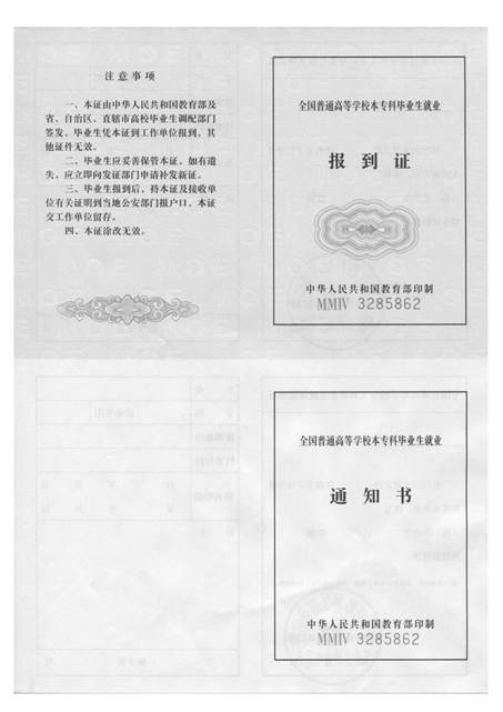 全國普通高等學校本專科畢業生就業報到證(樣本)