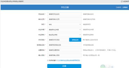 功能描述:學生通過山東高校畢業生就業信息網登錄/注冊入口,進入注冊界面,完成信息填寫,提交注冊信息驗證,驗證通過注冊成功。