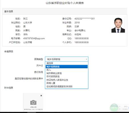 功能描述:實現山東省內院校困難家庭高校畢業生求職創業補貼申請填表功能。