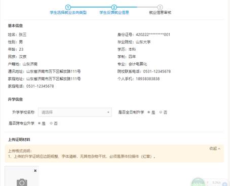 操作說明:學生如果升學,則選擇選擇升學類型,在界面按要求填寫升學信息并上傳證明材料。如有不確定信息可保存,暫不提交,確認無誤信息可保存并提交審核,也可以取消本次操作返回重新選擇就業去向。