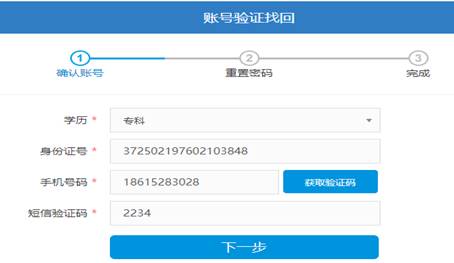 第一步:確認賬號。通過學歷、身份證號和手機號驗證賬戶,驗證通過進入下一步。